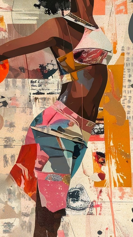 Voor dit werk zijn warme kleuren gebruikt, veel oranje rood, geel beigen en blauw, afgewisseld met zwarte roze en bruine accenten.