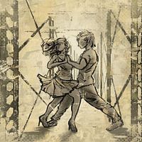 Het dansende koppel heb ik getekend met potlood en fineliner op papier. Deze tekening heb ik op de computer ingeladen in photoshop. Daar heb ik de tekening ingekleurd met geel en goudbruine kleuren.