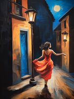 Een digitaal schilderij in olieverf stijl. Een vrouw met een rood oranje jurk danst tussen de huizen in een door lantaarns verlichtte steeg. De volle maan is rechts boven in de nachtelijke hemel te zien. Een kunstwerk met veel contrast. Het werk is gemaakt met donkerblauw, geel, oranje en rode tinten.