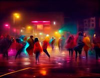 De menigte danst uitbundig door de straten op een zwoele zomeravond. Het neon licht zorgt voor een warm en broeiend geheel.