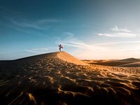 Dansend in een zee van zand, midden in de woestijn Dunas de Maspalomas in Gran Canaria terwijl de laatste zonnestralen de zandvormen accentueren.