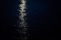 Reflectie van de maan over de zee, zorgt voor vuurwerk effect. Donkere, mysterieuze foto van dansend maanlicht. Sterk contrast tussen de zwarte zee en het lichte reflecterend maanlicht.