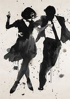 Een abstract schilderij van een goed gekleed stel dat samen wild danst.