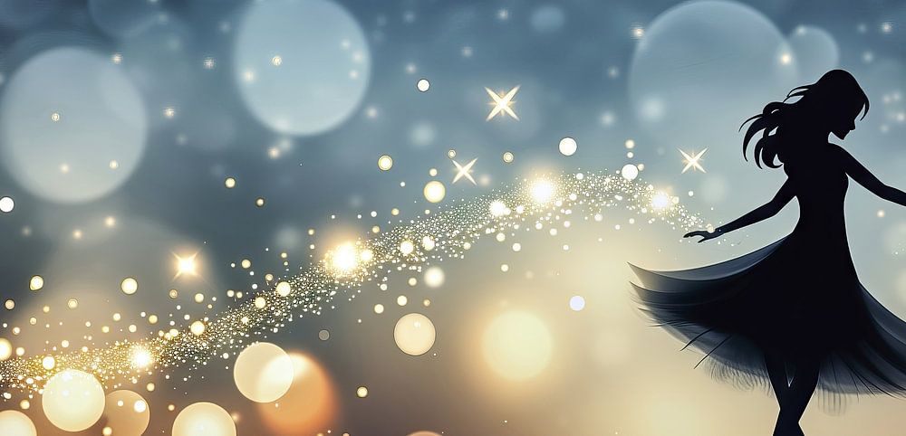 Dit silhouet toont een vrouw dansend in een vloeiende jurk tegen een bokeh achtergrond van blauwe en gele lichtcirkels. De elegante beweging van de vrouw wordt versterkt door de zachte contouren en het lichtspel terwijl ze moeiteloos door de ruimte lijkt te bewegen. De combinatie van de sierlijkheid van de dansbewegingen en de sfeervolle lichtstemming creëert een fascinerende sfeer vol gratie en dynamiek. De kleurrijke lichtcirkels geven de scène een sprookjesachtige kwaliteit en benadrukken de schoonheid van het moment, terwijl het silhouet van de vrouw de verbeelding van de kijker prikkelt. Deze foto nodigt je uit om betoverd te worden door de magie van dans en de schoonheid van licht.