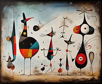 Dit levendige kunstwerk is een dynamische compositie vol fantasierijke figuren, sterk beïnvloed door de surrealistische stijl van Joan Miró. De schilderachtige achtergrond van lichtblauw en zandkleurige tinten creëert een dromerige, open ruimte waarin een parade van abstracte wezens tot leven komt. De figuren zijn een mix van strakke geometrische vormen, gebogen lijnen en expressieve, kleurrijke vlakken, wat een speelse en energieke sfeer oproept.