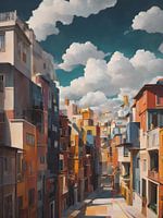 Dit stuk vangt een levendige straatscène, waar de architectuur zelf bijna als kleurrijke muzieknoten in de lucht lijkt te dansen. De gebouwen, met hun diverse tinten van oker, terracotta en azuur, vormen een visuele symfonie van licht en schaduw. De stijl is een moderne interpretatie van post-impressionisme, met een vleugje kubisme,…
