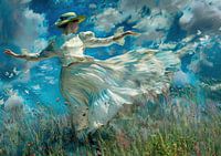 Dansende Vrouw | Ethereal Waltz - Dit vrouwen schilderij toont een elegant geklede dame, dansend in een bloeiend veld onder een dynamische blauwe lucht, verbeeld met een levendige mix van impressionistische en surrealistische stijlen.