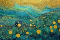 Dit werk toont een vloeiend samenspel van golvende lijnen en cirkels in tinten van blauw, groen en goud. De bovenste helft van het werk bestaat uit gouden en groene golven, die lijken te dansen op de ritme van de zee. De onderste helft toont een verzameling cirkels in verschillende maten en kleuren, die diepte en beweging suggereren.