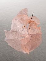 "Dansende blaadjes weerspiegelen in de ondergrond" is een macrofoto van een setje van blaadjes van de Bougainvillea. Deze plant heeft prachtige mooi gekleurde schutbaden. Doordat deze blaadjes al aardig gedroogd zijn in het Spaanse zonnetje, zie je de nerven erg goed en zijn de blaadjes dun geworden waardoor ze licht deels lijken door te laten.