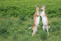 Twee damhertbokken rechtop tegen elkaar.