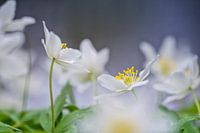 Deze bosanemonen stonden in het bos in een groepje bij elkaar aan de waterkant. Op de achtergrond is het water nog te zien, het geeft een blauw-paarse kleur in de foto. Ik was benieuwd of dat een mooie achtergrond zou zijn. In werkelijkheid was het water redelijk licht van kleur, maar bij het bewerken van de foto zag ik dat het toch donkerder over is gekomen. Maar daardoor vormt het wel weer een mooi contrast met de witte anemoontjes. Ook de gele meeldraden van de anemoon steken goed af tegen de donkerblauwe achtergrond. Naast het contrast dat zo ontstaan is, vind ik het leuk dat er enige beweging in de foto lijkt te zitten. Het is net of de anemonen dansen op hun sierlijke steeltjes.