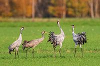 Over ‘Dansende en trompetterende kraanvogels in een veld tijdens de herfsttrek’ van Sjoerd van der Wal Fotografie