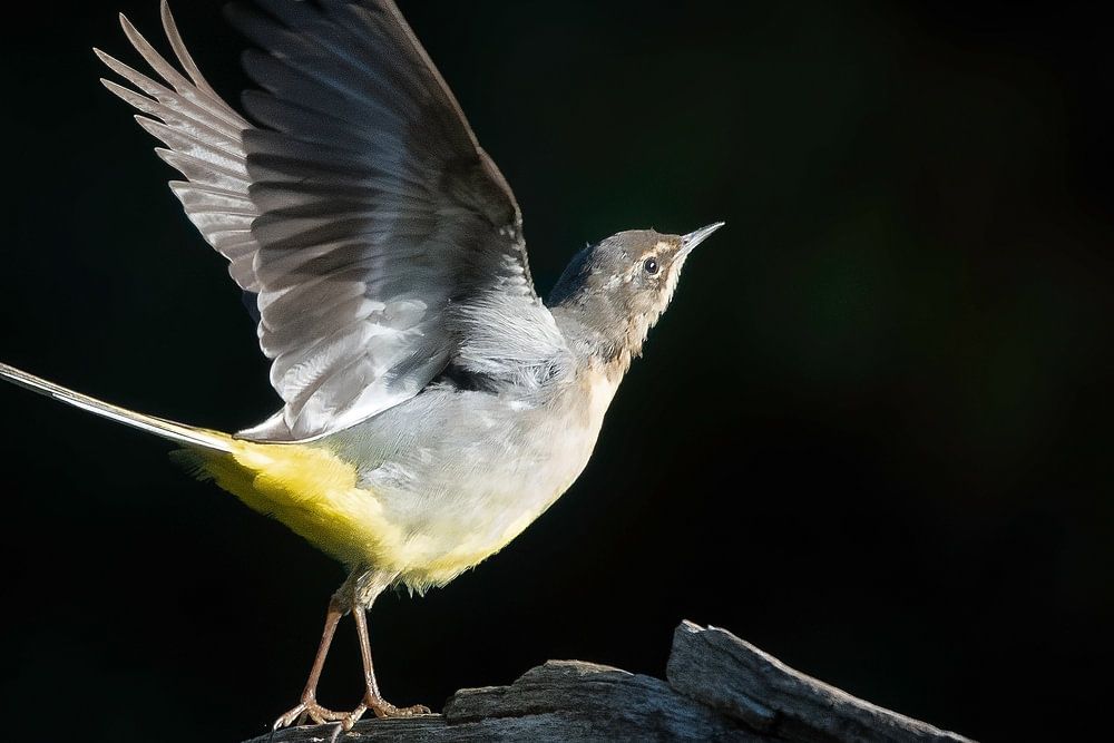 Op een bekende stek van mij komen ook geregeld grote gele kwikstaarten. Deze foto precies op het moment van wegvliegen gemaakt, waardoor het lijkt alsof deze vogel aan het dansen is.