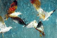 Dit prachtige schilderij is een viering van de vrijheid en de schoonheid van de natuur. Met de inspiratie en gebruik van mijn eigen foto's, brengt "Dansende meeuwen in de lucht" de elegantie en speelsheid van deze majestueuze vogels tot leven. De meeuwen lijken met elkaar te spelen, hun vleugels vormen sierlijke bogen en hun bewegingen weerspiegelen de dynamiek van de natuur. Het feit dat ik deze meeuwen zelf heb gefotografeerd en tot dit unieke beeld heb bewerkt, geeft dit kunstwerk voor mij een persoonlijk tintje. Hang dit kunstwerk op een mooi plekje op in je huis en geef deze ruimte een geweldig gevoel van vrijheid, speelsheid en beweging.