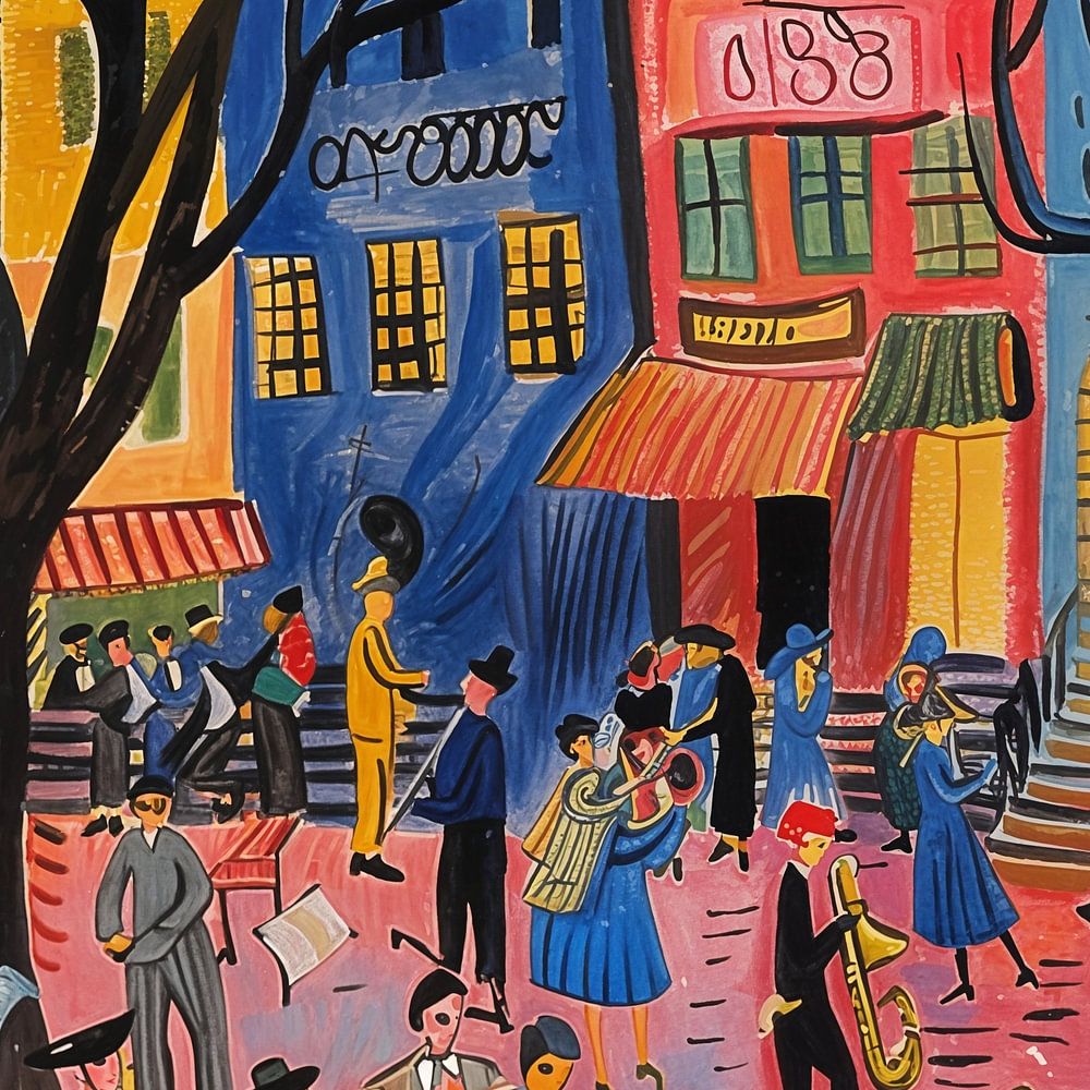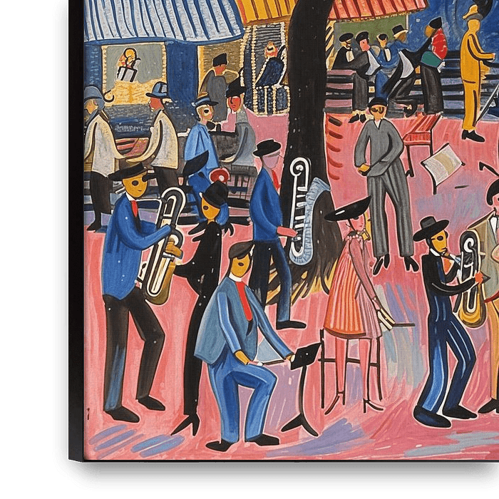 Dansende mensen jazz vibes schilderij is een levendig en sfeervol kunstwerk dat de energie van muziek, beweging en stadsleven samenbrengt. In dit schilderij zie je dansende mensen en muzikanten op een plein, omringd door hoge huizen die doen denken aan karakteristieke Amsterdamse gevels. De compositie ademt ritme en vrijheid en neemt je…