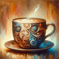 Deze kunstzinnig ontworpen koffiekop wordt omringd door een kosmos van dansende patronen en kleuren die de essentie van een stijlvolle koffie-ervaring vastleggen. De sierlijke ontwerpen op de beker spreken van rijke traditie en vakmanschap, terwijl de wervelingen van opstijgende stoom de frisheid en warmte van een vers gezette koffie vertegenwoordigen. Het kleurenpalet varieert van diepblauw en turkoois tot warme aarde- en crèmetinten, waardoor de compositie een bijna droomachtige kwaliteit krijgt. Dit schilderij combineert de aandacht voor detail en esthetiek van zowel de bereiding van koffie als het genot van deze populaire drank.