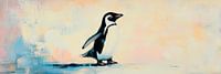Een dappere kleine pinguïn loopt vastberaden door een zacht, kleurrijk landschap. Zijn zwart-wit contrast straalt helderheid uit, terwijl de delicate pastelkleuren op de achtergrond een dromerige stemming creëren. Met opgeheven hoofd en een vleugje avontuur lijkt hij de wereld te verkennen, die gevuld is met een zacht lichtspel.