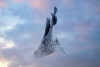 Spreeuwen dansen samen in een bewolkte lucht tijdens een kalme zonsondergang aan het einde van de dag. Enorme groepen spreeuwen (Sturnidae) in de lucht die bewegen in vormveranderende wolken voor de nacht.