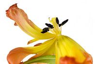 Een Close-up van een bloeiende gele tulp tegen een witte achtergrond. Een tulp groeit uit een bloembol. Door de compositie heeft het wat weg van een danseresje. Swingend met zwierende rokken.
