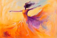 In een stralend spel van oranje en paarse kleuren ontvouwt een dansend silhouet haar gratie terwijl de wind door haar jurk blaast. Deze levendige voorstelling van vrijheid en beweging voegt een dynamische energie toe aan elke kamer en zou ideaal zijn voor een woonkamer, waar het creativiteit en levensvreugde uitstraalt.