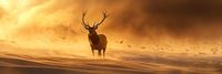 In een wazig landschap waar zand en lucht lijken te versmelten, staat een hert dromerig te kijken, omgeven door een zachte mist en een explosie van zonlicht. De oranje en gouden tinten dansen op zijn rug, terwijl een zwerm vogels in de verte wegzweeft. Dit tafereel vangt de ultieme rust en natuurlijke schoonheid van een moment in de natuur dat bijna onaards aanvoelt. Een bijzonder kunstwerk voor wie houdt van subtiele mystiek en dromerige landschappen.