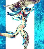 Tekening van een danser gecombineerd met grafische elementen. Heeft een verwijzing naar een grottekening, maar dan in een modern jasje.