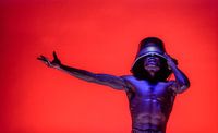 Danser op rode achtergrond, met emmer op hoofd, schreeuwend