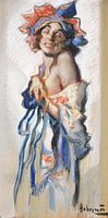 Deze artistieke vrouw heeft vrolijke kleren aan en kleuren in haar haar. Het moderne werk laat de meid zien met haar kleding van haar schouder waardoor een deel van haar boezem, sexy en licht erotisch op het portret staat.