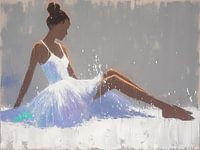 Danseres - Dit vrouwen schilderij toont een elegante danseres in een witte jurk, zittend met een pose die zowel rust als dynamiek uitstraalt, tegen een grauwe, textuurrijke achtergrond die een suggestie van urban decay geeft.