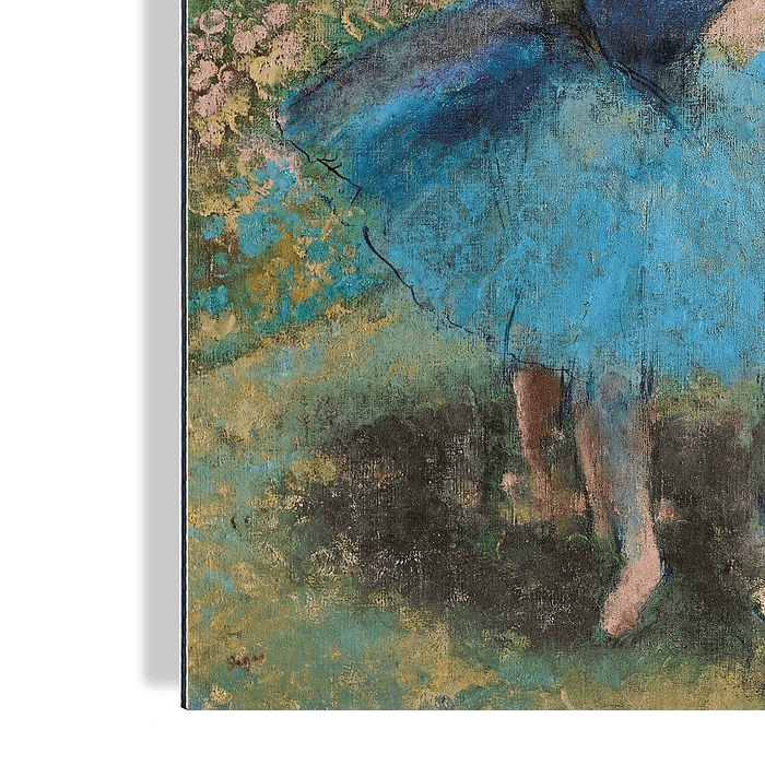 Degas' Dansers in blauw, getekend in pastel in de vroege jaren 1890 toen het zicht van de kunstenaar snel afnam, is een opmerkelijk intieme weergave uit het licht van de energie en de beweging van deze kleine groep ballerina's.