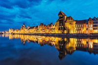 Blick ueber die Mottlau zur Langen Bruecke und dem Krantor bei Nacht. Das Krantor ist das bekannteste Wahrzeichen der Stadt, Danzig, Pomorskie, Pommern, Polen, Europa