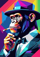 Geraffineerde aap in pak en fedora rookt kalm een sigaret, zijn gezicht gesneden uit scherpe, kleurrijke vlakken tegen een donkere achtergrond.