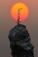 De foto toont een indrukwekkende mier die op een donkere rots staat terwijl de zon ondergaat op de achtergrond. De felle kleuren van de zonsondergang contrasteren met de ruwe textuur van de rots. Bijzonder opvallend is hoe de mier sierlijk een klein stuk hout draagt, wat zijn vastberadenheid en kracht symboliseert.