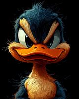 Een opvallend digitaal kunstwerk van een woeste zwarte eend met gloeiende oranje ogen en scherpe, gedetailleerde veren. De donkere belichting en dramatische uitdrukking creëren een krachtige aanwezigheid, een mix van realisme met een gedurfde, gestileerde touch. Een karakter vol houding en mysterie!