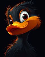Een opvallend digitaal kunstwerk van een woeste zwarte eend met gloeiende oranje ogen en scherpe, gedetailleerde veren. De donkere belichting en dramatische uitdrukking creëren een krachtige aanwezigheid, een mix van realisme met een gedurfde, gestileerde touch. Een karakter vol houding en mysterie!