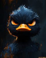 Een opvallend digitaal kunstwerk van een woeste zwarte eend met gloeiende oranje ogen en scherpe, gedetailleerde veren. De donkere belichting en dramatische uitdrukking creëren een krachtige aanwezigheid, een mix van realisme met een gedurfde, gestileerde touch. Een karakter vol houding en mysterie!