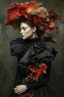 Een betoverend kunstwerk waarin dramatische contrasten tussen vurig rood en diepzwart samenkomen in een surrealistisch portret. Een weelderige compositie van paddenstoelachtige vormen in warmrode tinten vormt een spectaculair hoofddecor, terwijl een zwarte geplooide kraag en jurk voor een theatraal silhouet zorgen. De verfijnde texturen en lichtval creëren een mysterieuze, bijna Victorian Gothic sfeer die klassieke elegantie met moderne dramatiek verenigt.