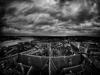 Donkere wolken pakken zich samen boven het kruisvormige dak van de st Stevenskerk. Achter de kerk is de benedenstad van Nijmegen te zien. Links in beeld de oude Waalbrug. De verbindingsroute die Nijmegen met de Betuwe verbindt.