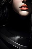 A.I. kunstwerk van een vrouw in duisternis gehuld met zwarte leren kleding en zwarte lange haren. Het werk heeft de titel "Duister verlangen" en kan hierdoor op meerdere manieren worden bekeken. Wat zie jij als je naar haar kijkt?