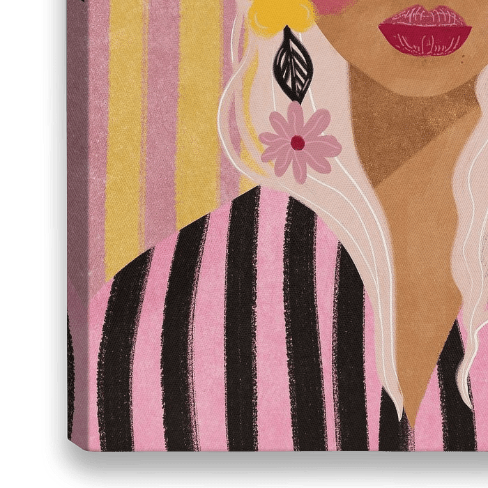 Illustratie van een portret van een vrouw met asblond haar, gestreept topje, tegen een gestreepte achtergrond met grote bloemoorbellen.