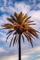 Kroon van een dadelpalm met palmbladeren en rijpe dadels voor de wolken