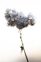 Daucus carota minimalime met vorst in de winter bij zonsondergang. Deze 2-jarige wilde plant komt vooral voor in wegbermen, droge graslanden, duinen en op dijken. De witte dunne wortel en het zaad zijn eetbaar. Een minimalistisch beeld met mooie warme kleuren.
