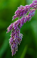 Een macro foto met dauw op bloeiend gras, gestreept witbol. Het is een erg gedetailleerde foto en de druppeltjes dauw zijn prachtig scherp.