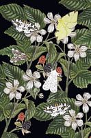 Een bonte verzameling van nachtvlinders op dauwbraam; bonte bessenvlinder, hagedoornvlinder, witte tijger en braamvlinder, getekend door natuurillustrator Jasper de Ruiter.