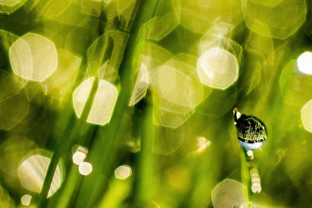 Mooie dauwdruppel op een grasspriet in de ochtendzon. Typisch verschijnsel die je ziet in de herfst en in het als de lucht weer wat vochtiger wordt. Deze foto heeft de hoofdkleur groen en is prachtig om er een behang van te maken of in het groot aan de muur. De foto is gemaakt met een macrolens en je ziet daarom veel bokeh.