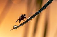 Een mooie oranje zonsopkomst en de natuur nog onder de dauwdruppels. Deze vlieg veegt de druppels van zich af en hoop snel op te drogen in de zon.