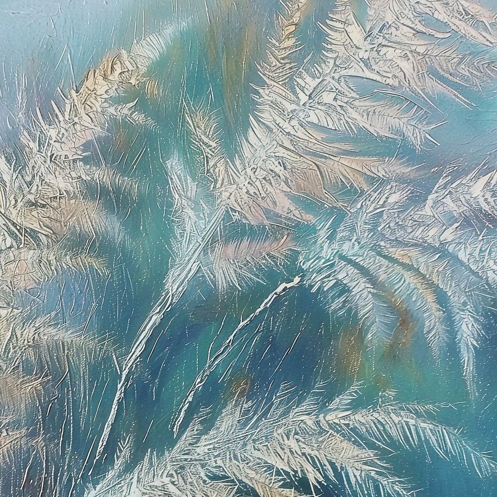 Delicate en poëtische interpretatie van pluizige planten, pampasgras, tegen een achtergrond van zachte pastelkleuren. De voorstelling, uitgevoerd in tinten van zilver, wit en goud op een canvas van blauw en turquoise, speelt met licht en textuur om een dromerige atmosfeer te creëren. De planten zijn met een bijna impressionistische techniek geschilderd, waarbij de details van elke pluim vervaagd zijn en meer suggereren dan definiëren.