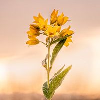 Macrofoto van een grote wederik. Er zitten allemaal kleine dauwdruppels op de plant. De foto is vlak na zonsopkomst genomen wat zorgt voor een zachte oranje achtergrond die mooi kleurt bij de gele bloemetjes en de groene bladeren. De scherpte op de foto ligt op het voorste bloemetje. Door het kleine scherptegebied lijkt het op een schilderij.