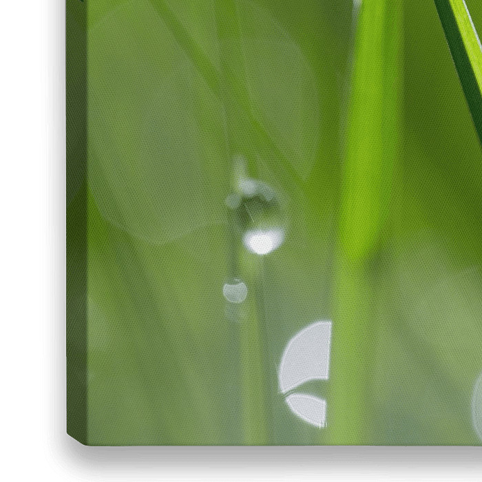 Een tegenlichtopname van dauwdruppels op grassprieten, gemaakt op een frisse lente ochtend.