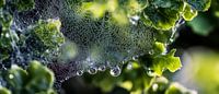 De delicate waterdruppels schitteren als kleine juwelen in een web van fijne spinnenwebben, omlijst door fris, groen gebladerte. Deze dromerige compositie van natuur en licht brengt rust en frisheid in elke woonkamer, ideaal voor een harmonieuze sfeer die uitnodigt om te blijven hangen. Een waar kunstwerk uit de natuur dat uitnodigt tot verwondering.